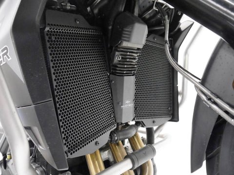 Weighing just 210 g, the guard delivers an excellent strength-to-weight balance. Its hexagonal mesh design provides effective protection against stones and road debris without restricting airflow, ensuring efficient heat dissipation under all riding conditions. Shaped to match the exact contours of the Tiger 900 radiator, it maintains a factory-quality appearance once installed.